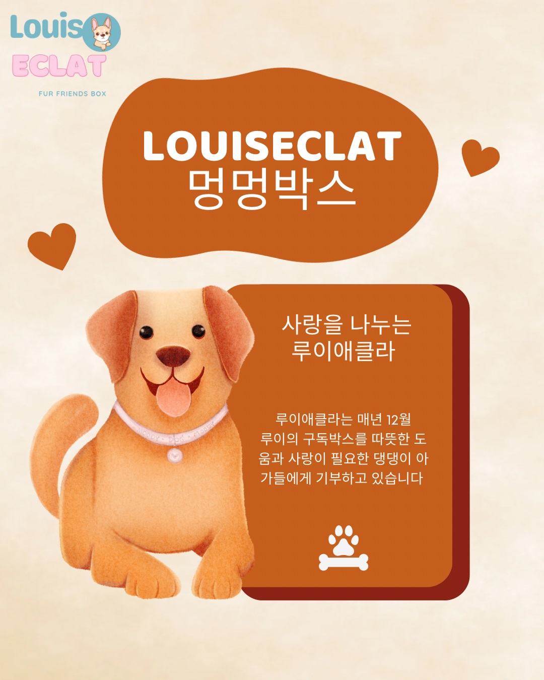 LouisEclat는 매달 반려동물에게 즐거움과 헹복을 선사하는 프리미엄 구독 박스를 배달합니다! 한달에 한번 다른 테마로 구성되는 박스 안에는 두 가지 간식, 두 가지 장난감, 그리고 깜짝 선물로 정성껏 채워져 있습니다.